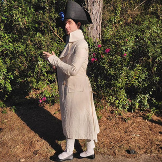 Reprodução casaca popular 1790/1800 em linho. Colarinho alto e fechamento duplo.